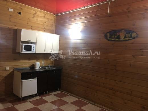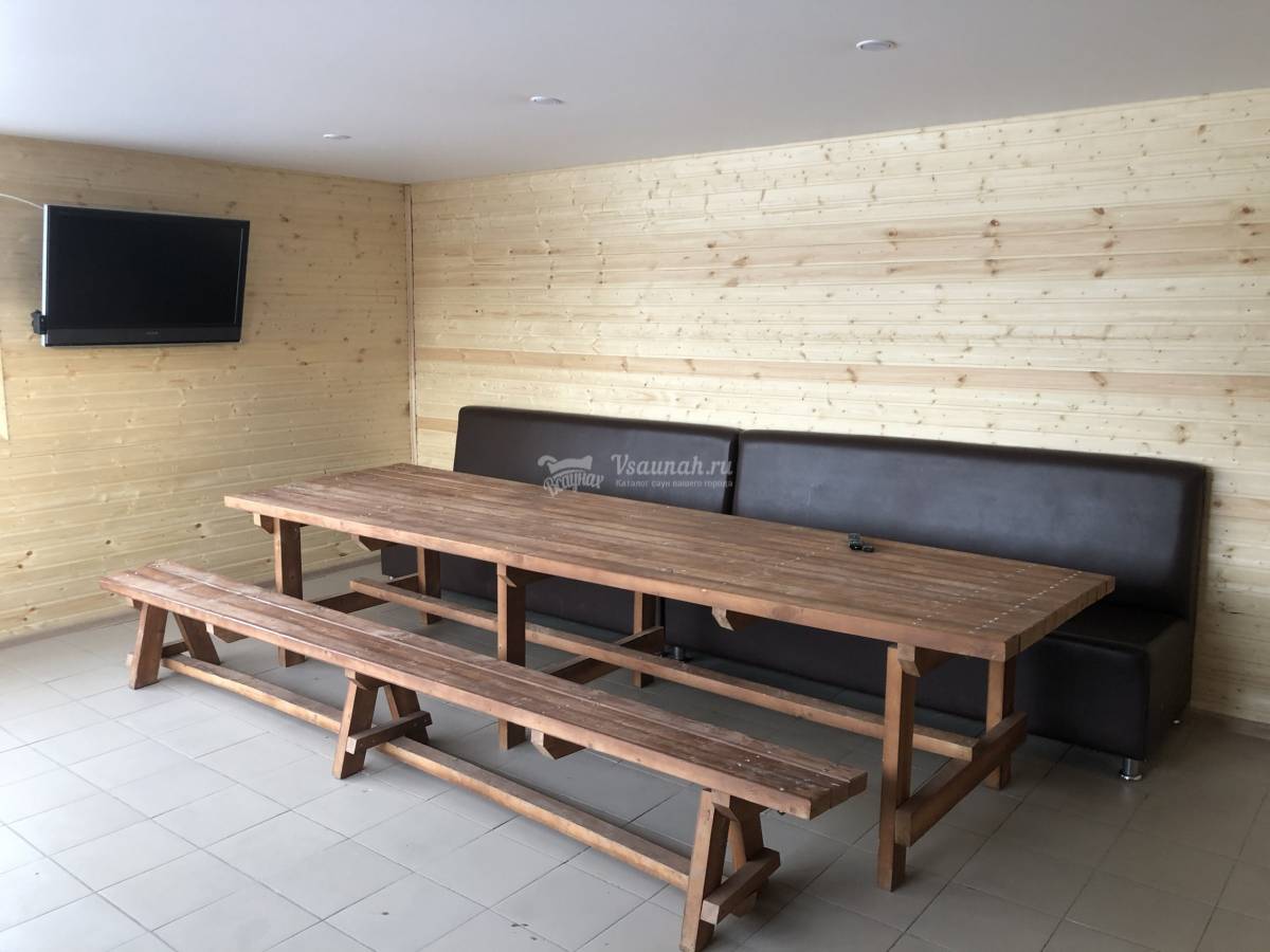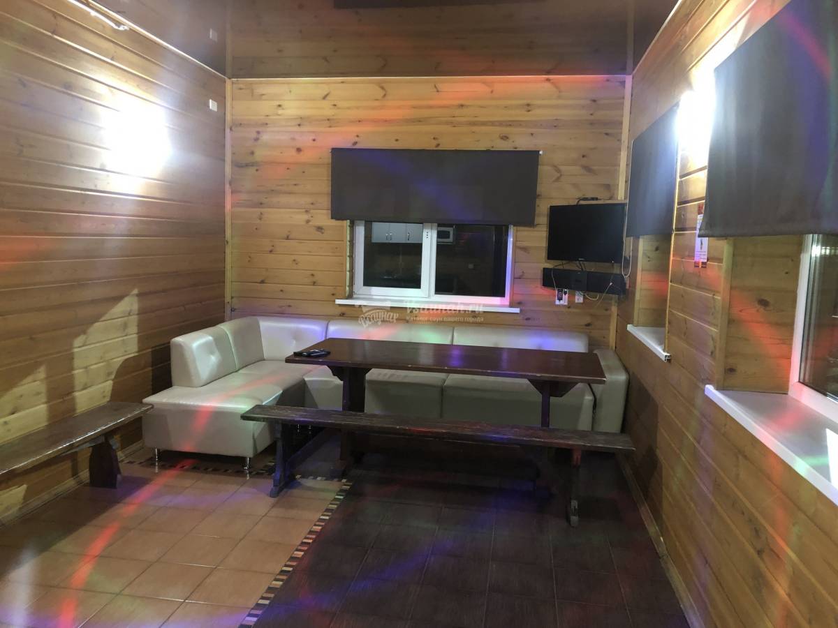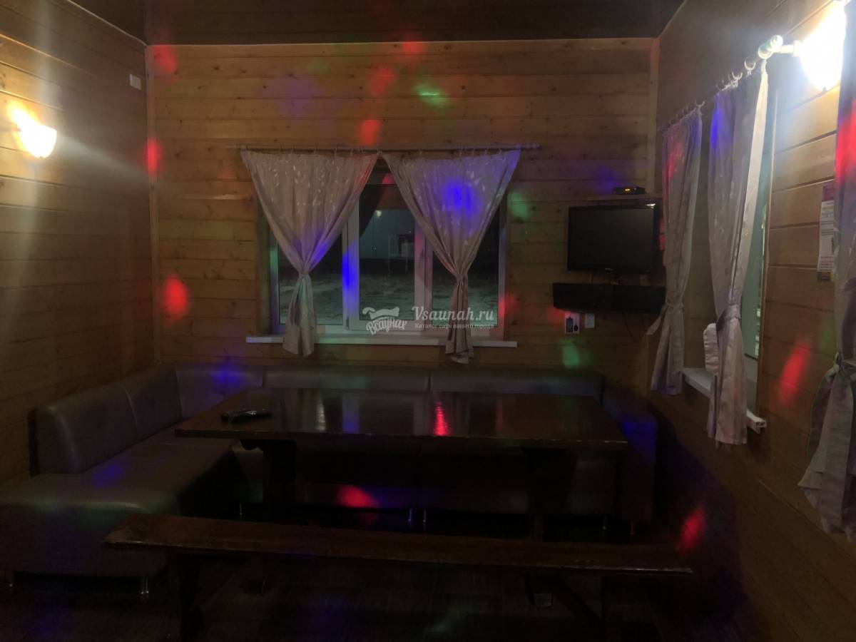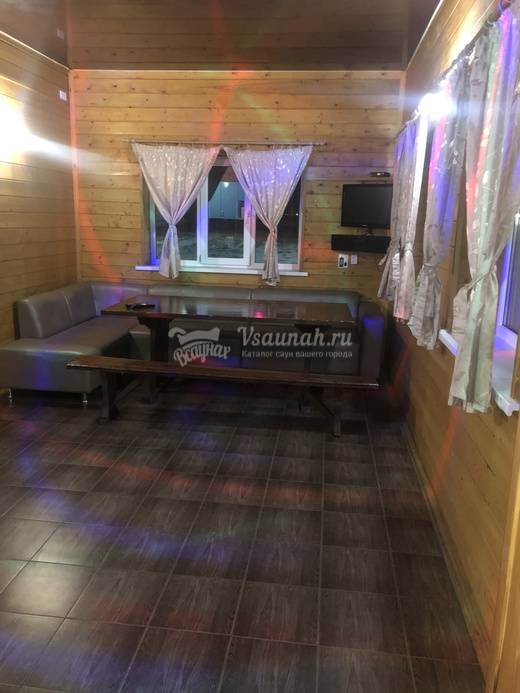 На первом этаже большой зал рассчитанный на 20 человек с телевизором и домашним кинотеатром, мини-кухней, парилкой на дровах, душ и сан узел.
